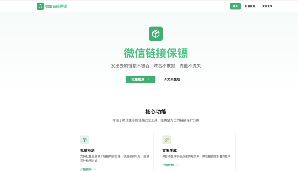 « 免费微信安全域名检测网站 时间:2026-1-30 18:10 作者:wanzi 分类: 无 地址: https://app-9aac1ax03ny9.appmiaoda.com/ 批量检测 支持批量检测多个链接的安全性,快速识别风险,提供三种检测方式 文案生成 AI自动生成吸引点击的短文案,降低被微信折叠的概率 上一篇 下一篇 取消回复