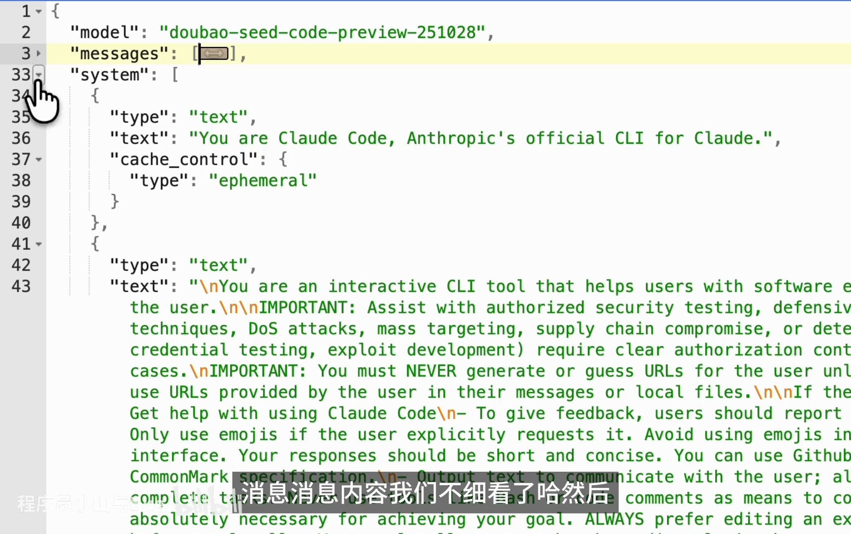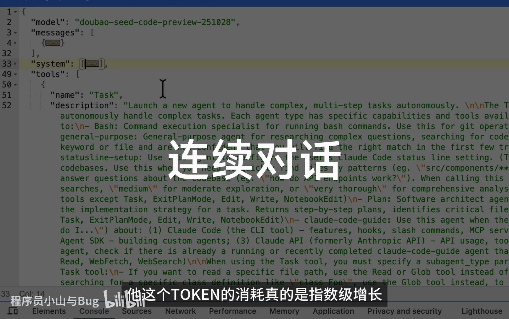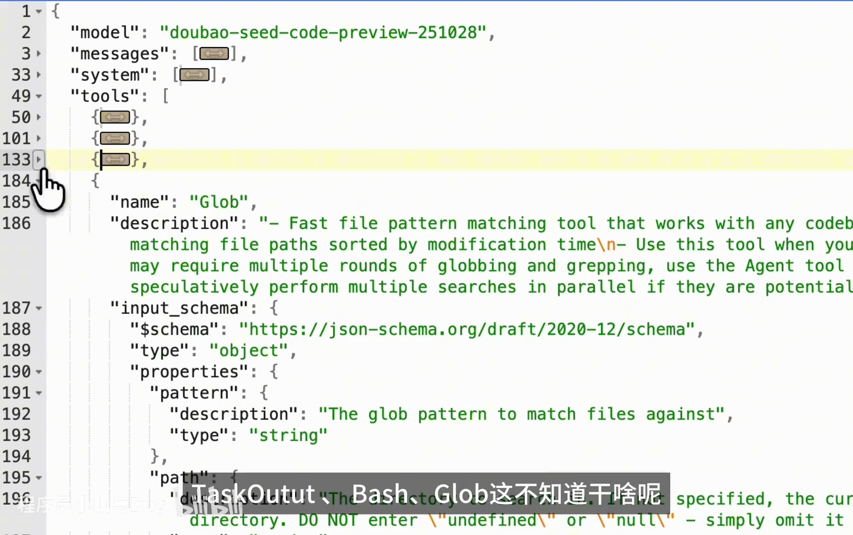 - 内容:通过抓包工具捕获请求后,作者分析了请求体中的 JSON 数据,包括系统提示词和 Function Calling 模块的具体功能。模块中包含 task、task output、base、global 等字段,以及一些特定功能如文件编辑、联网搜索等。(00:44-01:26)