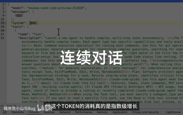 内容:即使是简单的“你好”输入,底层也会发送大量数据,消耗大量 Token。随着对话轮数增加,历史聊天记录必须携带,导致 Token 消耗呈指数级增长。(03:10-03:57)